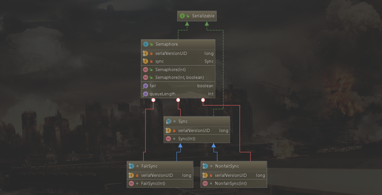 • Semaphore内部使用AQS实现,由抽象内部类Sync继承了AQS。因为Semaphore天生就是共享的场景,所以其内部实际上类似于共享锁的实现。